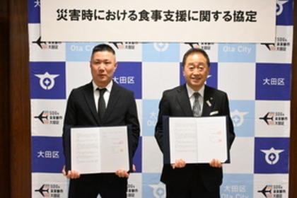 大田区と株式会社源長は、食事の提供及び運搬にご協力いただく「災害時における食事支援に関する協定」を締結いたしました。本協定により、1日あたり最大約2,000食の食事提供を受けられる見込みであり、避難所を中心に地域のニーズを踏まえた食事提供が期待されます。