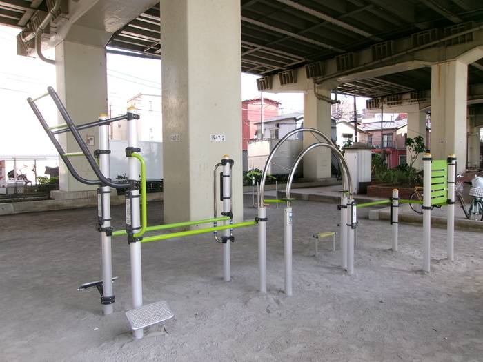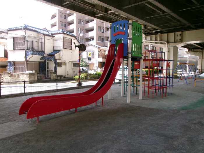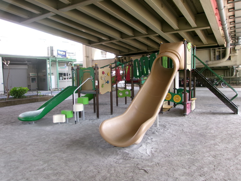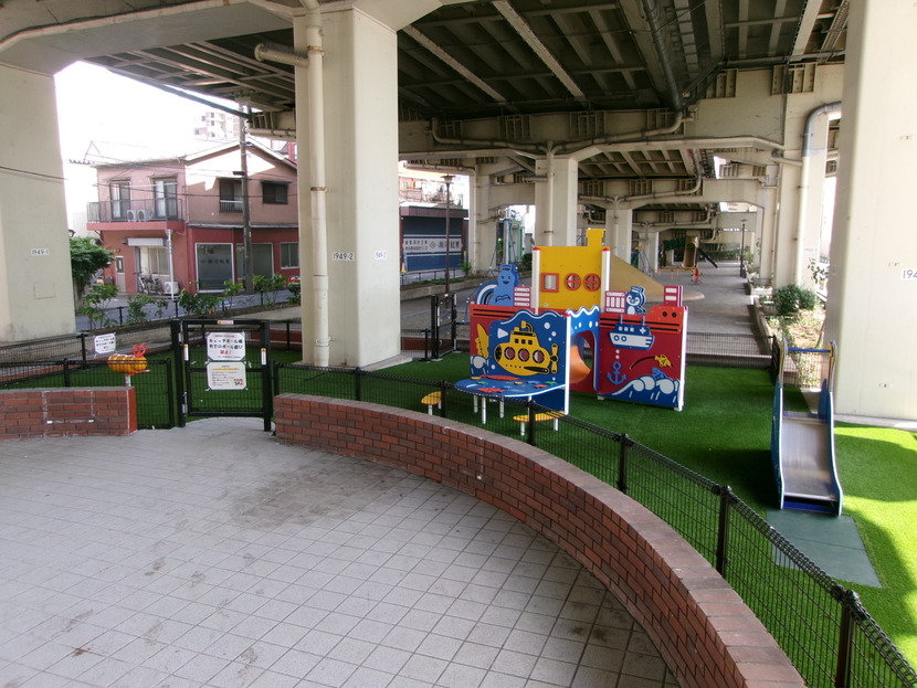 六間堀緑地は環状八号線を挟んで北側と南側のエリアに分かれており、首都高速の高架下に整備されていることから 雨の日でも濡れずに利用することができます。