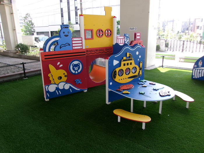 人工芝が敷かれた乳幼児用遊具のある広場です。乳幼児優先でご利用をお願いします。